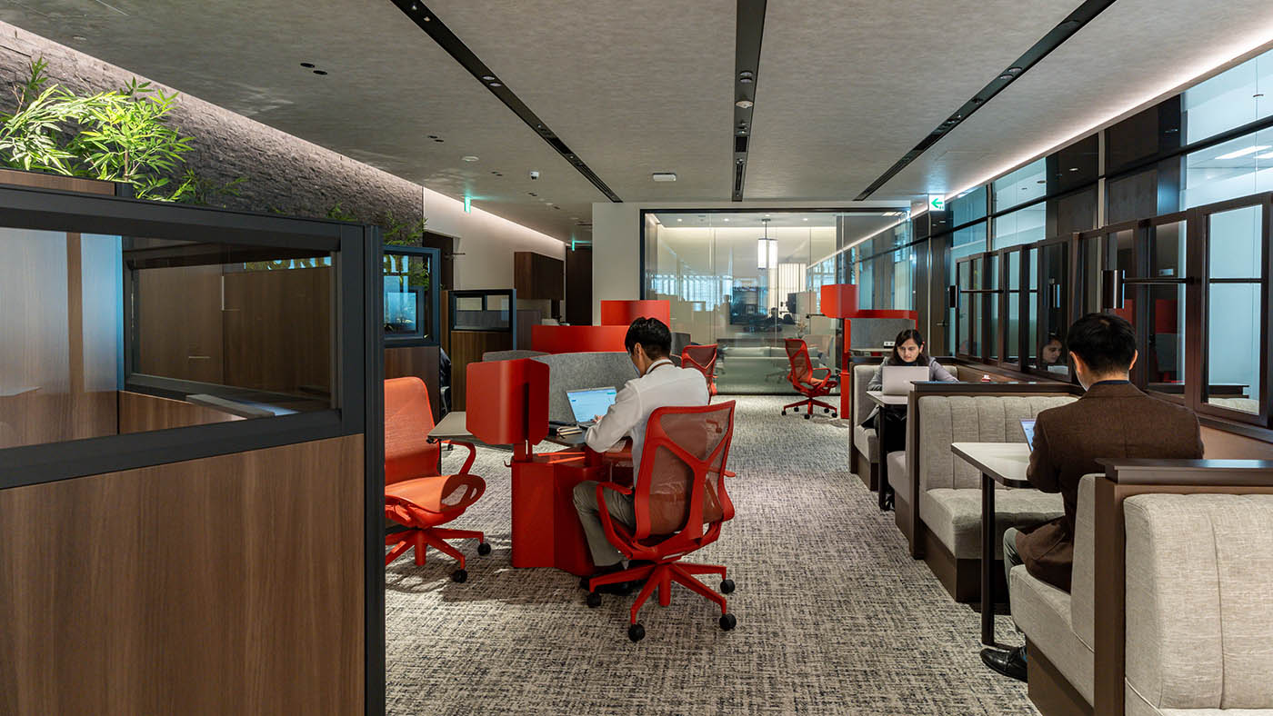 フリーアドレスのラウンジには、自由に使えるビジネスグレードのデスクと通信設備、完全個室のフォンブースや専用ロッカー、バリスタバーをご用意しました。別途オプションでは、会社設立・登記手続きに関する相談受付、総務・秘書サポートやITサポート、会議室のレンタルなども提供します。